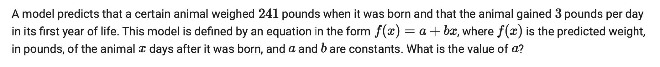 Dạng toán có lời văn thì sẽ giao với dạng Interpretation, và mình sẽ cần hiểu xem mỗi giá trị được nhắc tới thật ra là gì. Như trong ví dụ trên thì f(x) là giá trị được dự đoán, a ở trên là y-intercept, b là slope (mức độ thay đổi), còn x là số ngày sau khi ra đời. Mình biết là khi mới ra đời hay x = 0 thì con đó nặng 241 pounds, thay vào phương trình thì ta có 241 = a + 0b = a. Vậy nên mình tìm được a là 241.