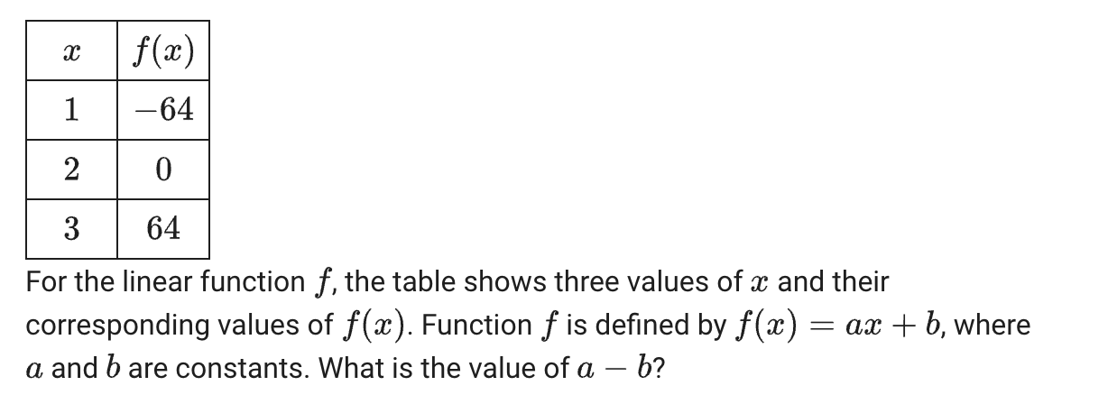 Với ví dụ này, mình sẽ dựa vào bảng có 2 giá trị là x và giá trị tương ứng của hàm số với mỗi giá trị của x. Bài này cách tiếp cận cũng sẽ là thay số vào cho đến khi mình tìm được đáp án phù hợp. Với x = 1 thì f(x) = -64, tức là -64 = a + b. Sau đó mình có với x = 2 thì f(x) = 0. Vậy nên 0 = 2a + b. Chỉ từ 2 cái trên là mình đã ra được một hệ phương trình