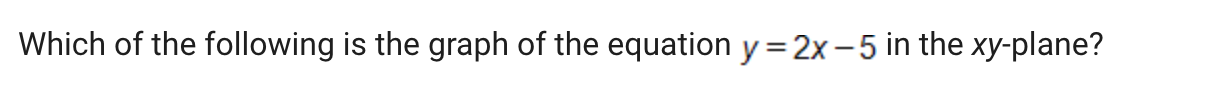 Mình có thể để ý ngay là slope = 2 nên đường thẳng hướng lên trên, và y-intercept tại -5. Nên nhanh chóng thấy được luôn đáp án là đây